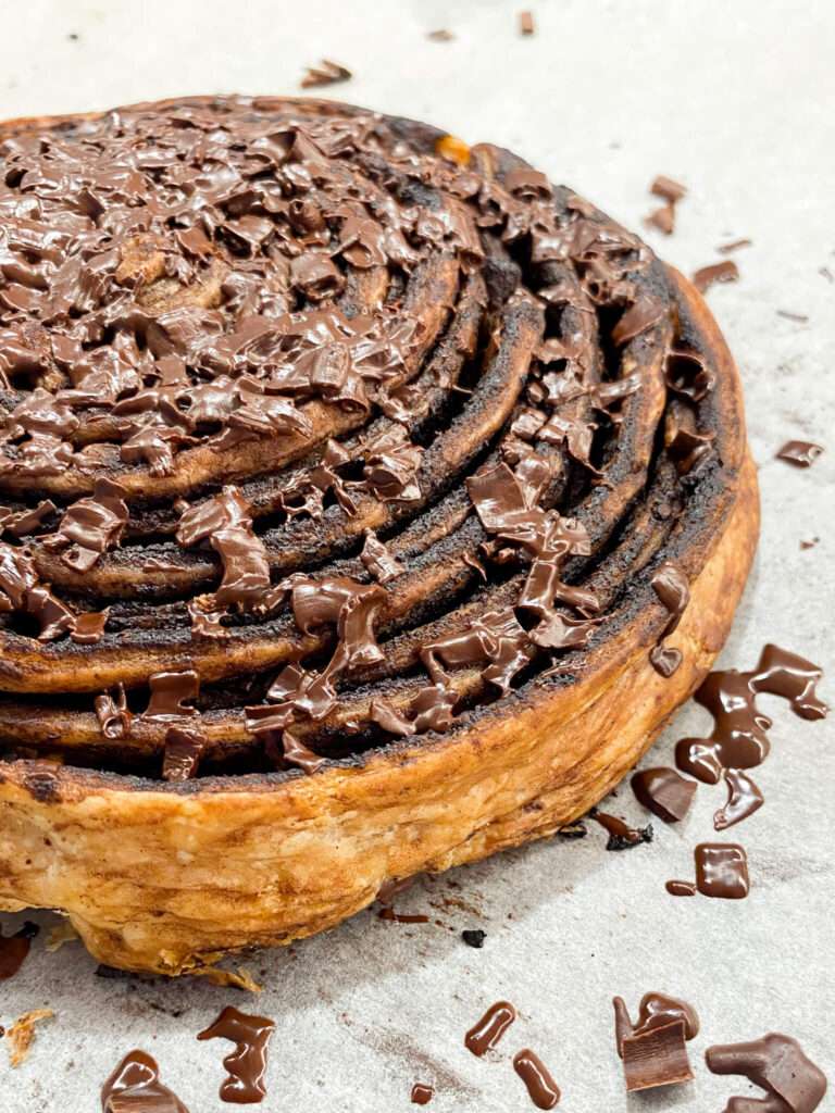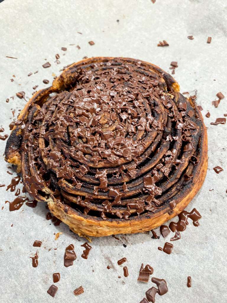 A kitekert tésztát kend meg vajjal, egyenletesen szórd rá a kakaós keveréket és reszeld rá a csoki kb. kétharmadát. A tésztát hosszában vágd fel 8 csíkra. Az elsőt tekerd fel, majd a többit hozzáillesztve készíts egy nagy csigát. Mehet is a tepsire, aztán már csak kend meg a maradék vajjal és légkeveréssel kb. 35-40 perc alatt süsd készre. Még forrón reszeld rá a maradék étcsokit.